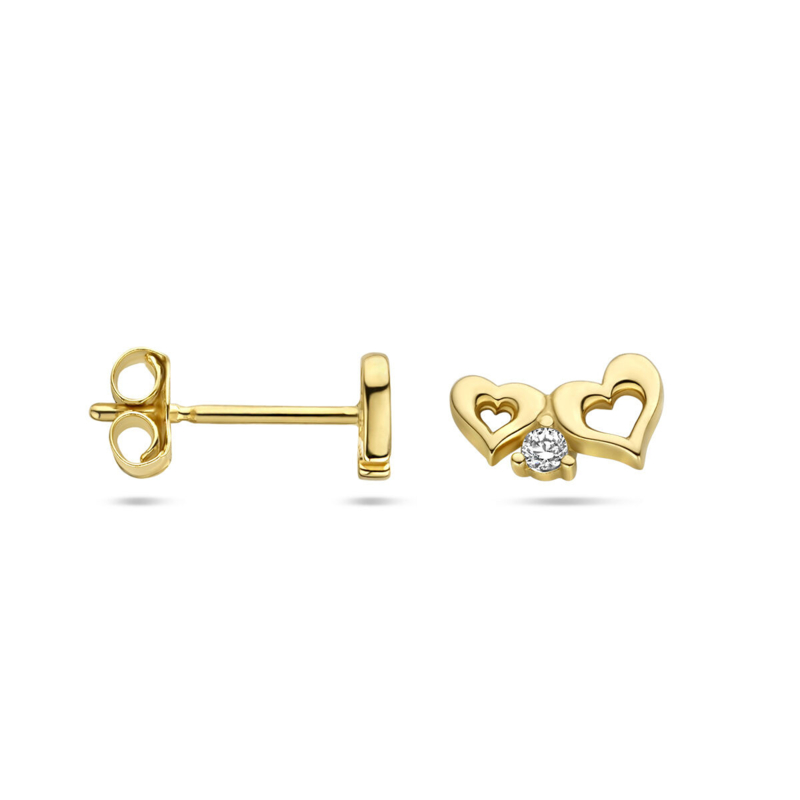 14k Geelgouden oorknoppen uitgevoerd met hartjes en zirkonia. De oorknoppen hebben een afmeting van 4x7mm.