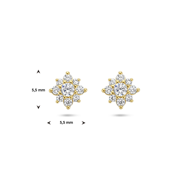 14k Geelgouden oorknoppen in de vorm van een bloem met zirkonia. De oorknoppen hebben een afmeting van 5.5x5.5mm.