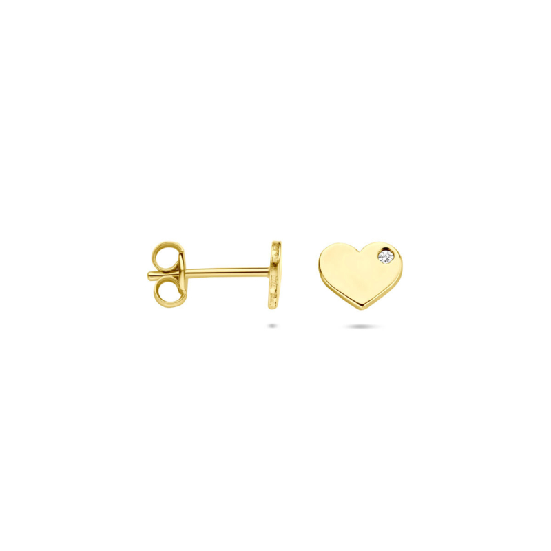 14k Geelgouden oorknoppen uitgevoerd in de vorm van een hartje met zirkonia. De oorknoppen hebben een afmeting van 5x6mm.